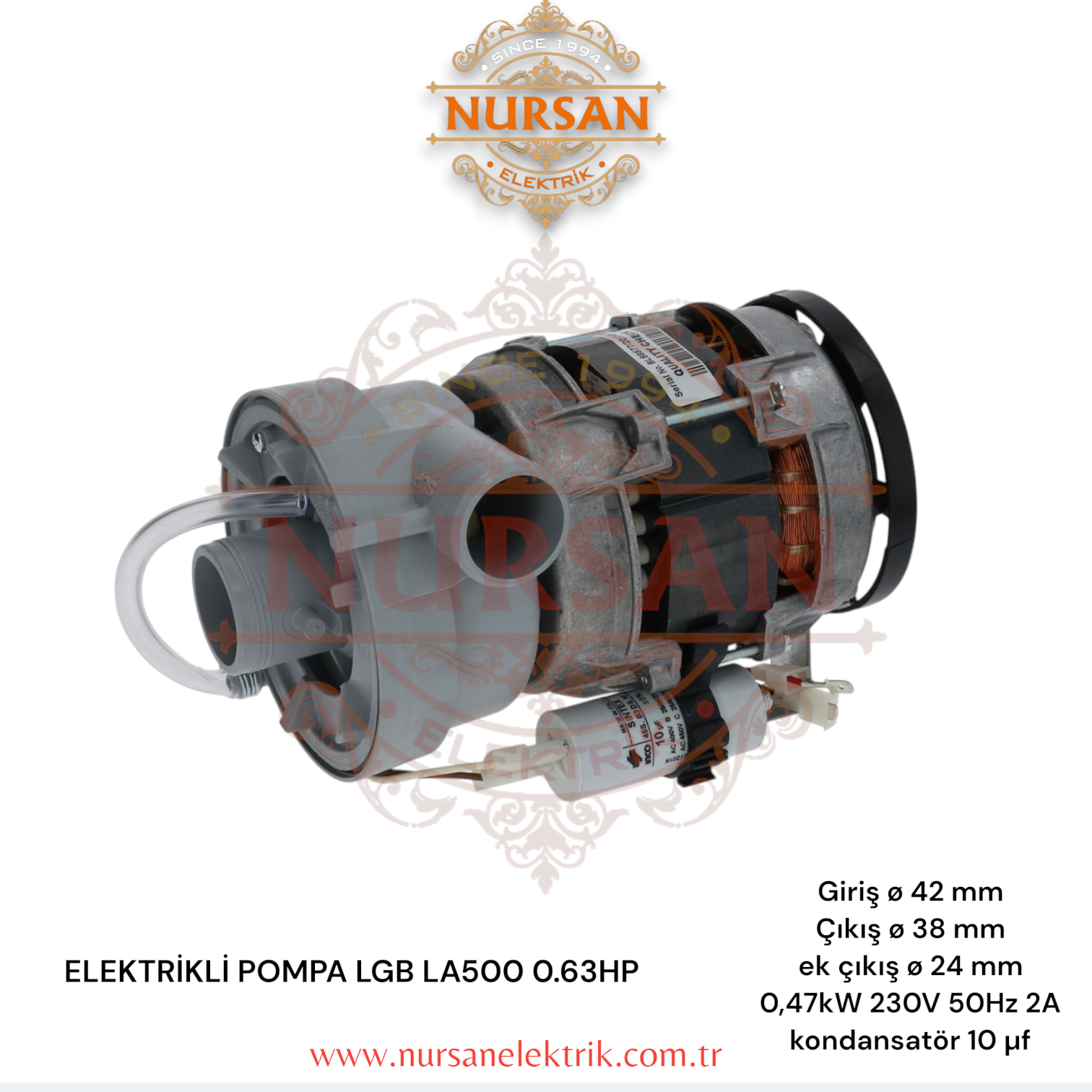 Giriş ø 42 mm Çıkış ø 38 mm ek çıkış ø 24 mm 0,47kW 230V 50Hz 2A kondansatör 10 µf